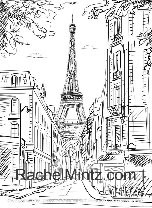 Paris Love - Eiffel Tower, Streets, Cafes, Hand Sketched Coloring (PDF Book)