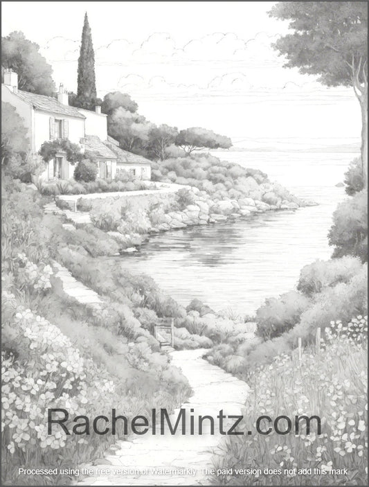 Serene Horizons - Relaxing Grayscale Landscapes Coloring Book, Rural, Mediterranean, Meadows (Digital PDF Book)